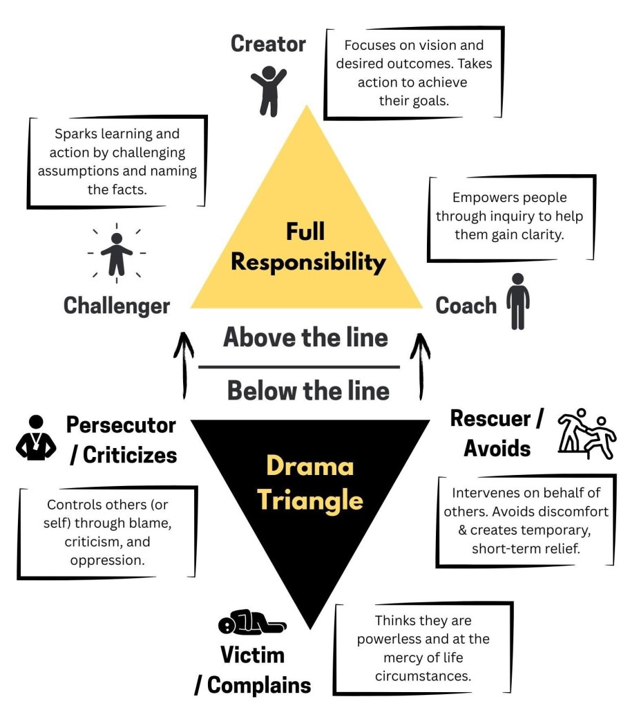 It was much later when I realized that I was stuck in the ‘drama triangle’—I felt deeply powerless as the ‘victim’ in this whole process, struggling and bargaining with a ‘persecutor’ who keeps demanding things from me, things I was not ready to provide. It was during a ‘leadership session’ at the LSE 100x that I realized only I could flip the switch and be a ‘creator’ in a world I want to see.